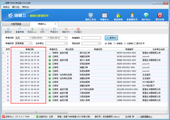信管飛RMS是集采購管理、銷售管理、庫存管理、往來應收應付款等一體化的進銷存管理軟件,軟件支持單據(jù)中心功能,在單據(jù)中心內(nèi)可以查詢到軟件內(nèi)所填開的所有業(yè)務單據(jù),可以根據(jù)單據(jù)日期、單據(jù)編號、單據(jù)類別、往來單位、商品名稱、審核狀態(tài)等信息查詢所需單據(jù),查詢結(jié)果默認是根據(jù)單據(jù)日期正序顯示,如下圖所示。 如需設置單據(jù)中心按單據(jù)日期倒敘顯