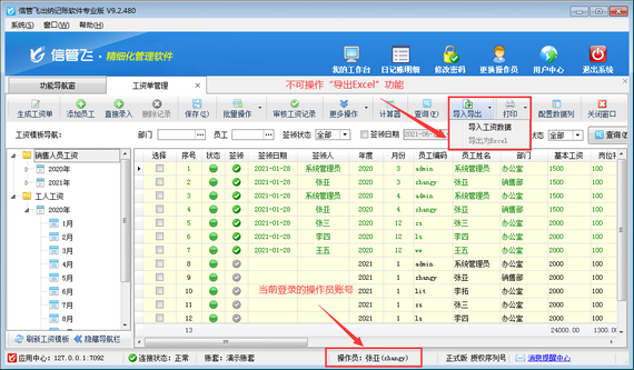 信管飛出納記賬軟件專業(yè)版包括工資管理功能,支持自定義工資模板管理員工工資單,可根據(jù)設置的工資模板快速生成工資單,支持從上月工資單復制工資項目數(shù)據(jù)。為了避免操作員導出工資單,軟件中可以設置操作員不可導出工資記錄權限。下邊我們在軟件中示范下設置操作員不可導出工資記錄權限的操作步驟。 登錄軟件,在功能導航窗點擊“系統(tǒng)管理”—》“操