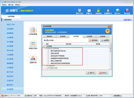 信管飛軟件系列產品都支持靈活配置業務參數,支持設置多個操作員賬號及操作員權限,本文介紹下信管飛RMS業務參數中系統安全及權限參數如何使用。 在功能導航窗點擊“系統管理”—》“系統參數配置”—》“業務參數”可以打開業務參數配置界面,啟用全部折疊,找到“系統安全及權限參數”,可以看到“系統安全及權限參數”包含以下參數,如下圖所示: