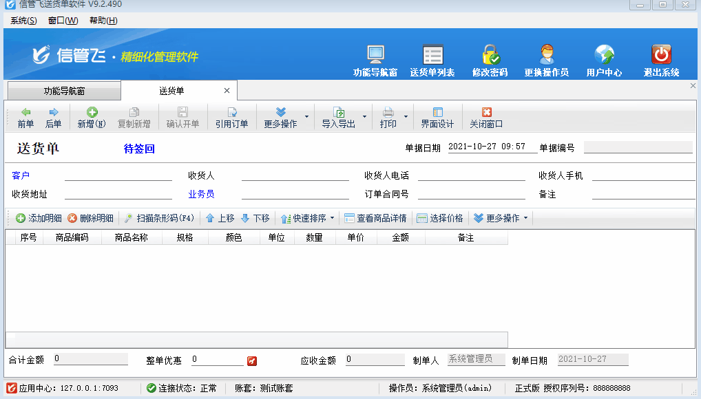 信管飛送貨單軟件是一款針對(duì)中小型企業(yè)開發(fā)的集送貨管理(發(fā)貨管理)、退貨管理(銷售退貨)、銷售收款(應(yīng)收款管理)等功能為一體的簡(jiǎn)單、易用的送貨管理及打印軟件,軟件支持把常用的商品提前錄入,開單支持直接選擇。對(duì)于一種商品存在多種規(guī)格的情況,軟件可在基礎(chǔ)資料商品信息規(guī)格中添加多種規(guī)格,開單的時(shí)候選擇此商品后規(guī)格可以選擇輸入。本文示范下如何操作?