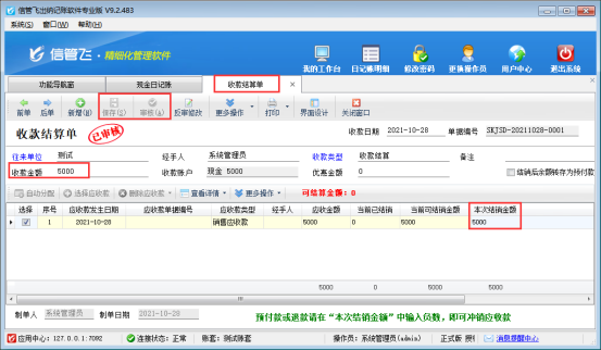 信管飛出納記賬軟件是集出納日記賬、應(yīng)收應(yīng)付款管理、發(fā)票管理為一體的軟件,軟件支持登記客戶的應(yīng)收應(yīng)付款時(shí)直接轉(zhuǎn)記出納憑證,后期實(shí)際收款支持在出納日記賬界面進(jìn)行核銷結(jié)算。本文以應(yīng)收款管理的結(jié)算進(jìn)行示范。 功能導(dǎo)航窗“往來管理”—》“應(yīng)收款管理”中,新增一筆客戶“測(cè)試”的應(yīng)收款記錄,應(yīng)收金額5000元,保存